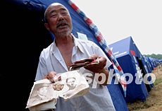 溫家寶總理七月十二日在安徽省阜南縣王家壩看望的七十二歲災(zāi)民鄭治學(xué),原來(lái)是抗美援朝老戰(zhàn)士,他至今在救災(zāi)帳篷里保存著當(dāng)年志愿軍彭徳懷司令員和朝鮮金日成將軍的圖片等紀(jì)念品。中新社記者:賈國(guó)榮