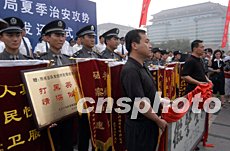 北京警方二十七日舉行“夏季治安攻勢追繳物品發(fā)還儀式”,部分被盜汽車失主取回汽車后向警方贈(zèng)送錦旗。中新社記者:任海霞