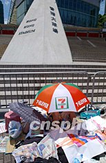 香港超級(jí)球迷7月28日忍受烈日煎熬在香港大球場(chǎng)排隊(duì),準(zhǔn)備輪候購(gòu)買“皇家馬德里”蒞港作賽入場(chǎng)券。作者:洪少葵