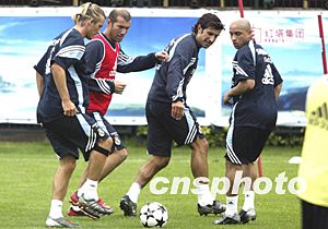 據(jù)新聞晨報消息,在主力組中,貝克漢姆的位置是右前衛(wèi),原本打這個位置的另一名巨星菲戈被放在左前衛(wèi)的位置上。既然皇馬已經(jīng)開始試驗這樣的中場組合,那么小貝很有希望在8月2日和龍之隊的比賽中作為主力亮相工體。