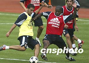 皇家馬德里足球隊(duì)二十九日下午在昆明拓東體育場(chǎng)舉行公開(kāi)訓(xùn)練與分隊(duì)比賽,圖為前鋒勞爾起腳射門。中新社記者:毛建軍