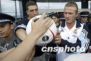貝克漢姆為狂熱的中國球迷簽名。中新社記者:毛建軍