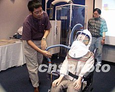 香港科技大學(xué)31日舉行流動呼吸感染控制裝置簡介會,該裝置適用于醫(yī)院病房及救護車,可以確保醫(yī)護人員在治療“非典”等傳染病病人時,免受感染。圖為科大安全及環(huán)保處高級工程師俞宗岱博士(左)進行現(xiàn)場示范。作者:謝育元