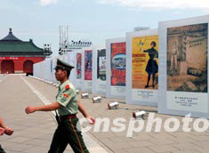 歷屆奧運會會徽宣傳畫八月三日列陣北京天壇祈年殿前的昔日皇家神路兩旁,迎候神秘的北京2008年奧運會會徽當晚夜幕降臨時在此大白于天下。中新社記者:賈國榮