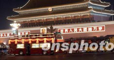 北京2008年奧運(yùn)會(huì)徽八月三日晚九時(shí)正式揭曉前,載著奧運(yùn)會(huì)徽的彩車(chē)晚上八時(shí)十一分經(jīng)過(guò)天安門(mén)。中新社記者:張煒