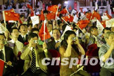 2008年北京奧運(yùn)會(huì)徽八月三日晚九時(shí)整在北京天壇祈年殿正式揭曉,現(xiàn)場(chǎng)觀眾紛紛舉起相機(jī)搶拍揭曉瞬間。中新社記者:毛建軍