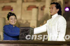 北京2008年奧運(yùn)會(huì)會(huì)徽發(fā)布儀式八月三日晚在北京天壇祈年殿前廣場(chǎng)隆重舉行,著名影星成龍與乒乓球世界冠軍鄧亞萍護(hù)送會(huì)徽到天壇祈年殿。中新社記者:毛建軍