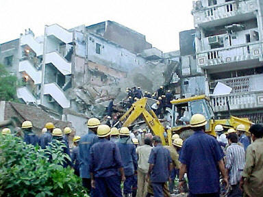 8月3日,救援人員在印度西部古吉拉特邦蘇拉特市一爆炸現(xiàn)場(chǎng)搜尋遇難者。蘇拉特市當(dāng)日凌晨發(fā)生煤氣罐爆炸事件,造成一棟三層的居民樓倒塌,至少有17人死亡,39人受傷。