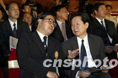 出席儀式的香港嘉賓霍震霆與國(guó)務(wù)院港澳辦副主任陳佐耳一起交談。