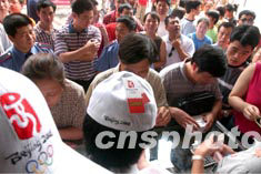 八月四日是2008北京奧運(yùn)會(huì)徽揭曉后的第一天,大批市民一大早擁向北京百貨大樓搶購(gòu)T恤衫、球帽等會(huì)徽紀(jì)念產(chǎn)品。中新社記者:張煒