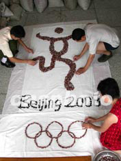 江蘇南京雨花石收藏家曹萍用兩天時(shí)間,從十萬枚雨花石中精選出直徑二至三公分的二00八枚精品雨花石,制作了一幅長二點(diǎn)五米、寬一點(diǎn)八米的北京奧運(yùn)會(huì)徽,以表達(dá)祝愿北京奧運(yùn)會(huì)成功舉辦的美好心愿。作者:陳旻