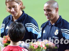 八月六日晚,香港舉行歡迎西班牙皇家馬德里足球隊抵港記者會,圖為小朋友向“皇馬 ”球星獻花。中新社記者:錢興強