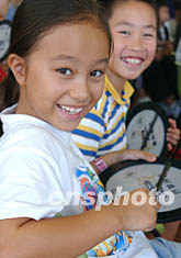 香港堅尼地小學(xué),八月十一日在香港舉行學(xué)習(xí)鼓樂活動,圖為小朋友興高采烈練習(xí)擊鼓節(jié)奏。中新社記者:錢興強