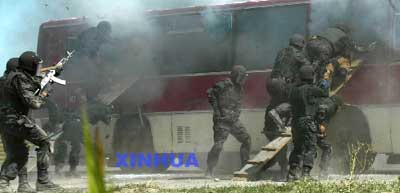 中國(guó)特戰(zhàn)隊(duì)員在依托步戰(zhàn)車進(jìn)行反恐演練。在擔(dān)負(fù)“城鎮(zhèn)清剿,解救人質(zhì)”的參演部隊(duì)中,還有一支由100多名指揮官和士兵組成的反恐分隊(duì)。這支分隊(duì)從組建至今,曾多次為外軍領(lǐng)導(dǎo)做過(guò)摩托車特技、飛車抓捕、攀登、戰(zhàn)術(shù)課目等軍事表演,受到了外軍領(lǐng)導(dǎo)人的高度評(píng)價(jià)。據(jù)介紹,在正式演習(xí)之前,這支反恐特戰(zhàn)分隊(duì)的隊(duì)員們每天都定下一個(gè)目標(biāo),利用臨睡之前的半個(gè)小時(shí)進(jìn)行演練。隊(duì)長(zhǎng)薛峰每天都與戰(zhàn)士們汗流浹背地在野外山地苦練,一個(gè)動(dòng)作,一招一式,絲毫也不馬虎。這支部隊(duì)的負(fù)責(zé)人曹鴻建說(shuō),反恐作戰(zhàn)不能沿用傳統(tǒng)的思維方式和戰(zhàn)法,為了應(yīng)付不同環(huán)境、不同條件下的突發(fā)事件,他們長(zhǎng)年進(jìn)行高強(qiáng)度、高難度的全面錘煉,目前,官兵們已全部進(jìn)入臨演狀態(tài),有信心完成這次多國(guó)聯(lián)合演習(xí)中的任務(wù)。