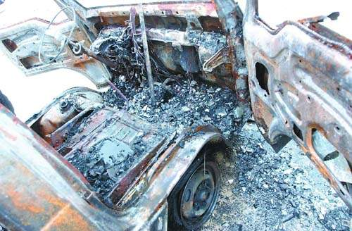 肇事的車子是0.6噸貨車,車上的擋風(fēng)玻璃已經(jīng)完全破碎,前兩輪胎處只剩下架子,方向盤只剩下圓形金屬,以及一把土制手槍、一把尖刀。值得一提的是,在車輛的殘骸上還有大量的塑料桶,有的是藍色,有的是白色,據(jù)一保安介紹,這些塑料桶是用來裝易燃液體的。昨天上午9時47分,一輛車身標志是“刑事勘察車”的車輛駛?cè)氪逦瘯笤海瑥能嚿献呦聛頂?shù)位警員,現(xiàn)場一共10多名警察不時交談著什么。最后警察將所有證物搬上車子后方離開。
