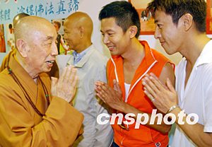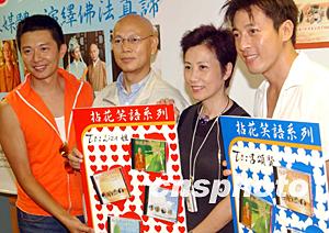 由星加坡福海禪院與好合拍多媒體集團合作出版的《拈花笑語系列》光盤發(fā)布會八月十八日在香港舉行,圖為明義法師(左)與香港藝員何寶生(中)、呂頌賢(右)在新聞發(fā)布會上。中新社記者:錢興強
