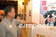 曾蔭培參觀“正確使用999緊急電話”海報設計獲獎作品。中新社記者:錢興強
