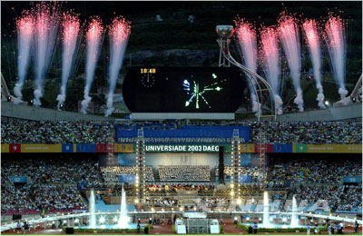 據(jù)新華網(wǎng)消息,繼北京成功舉辦第二十一屆世界大學(xué)生運(yùn)動(dòng)會(huì),國(guó)際大體聯(lián)在新世紀(jì)之初第二次選擇了亞洲。經(jīng)過兩年不懈的努力,只有200多萬人口的大邱將一幅精心繪制的青春畫卷展現(xiàn)在了來賓面前。韓國(guó)總統(tǒng)盧武鉉21日晚在這里宣布大運(yùn)會(huì)開幕,標(biāo)志著亞洲體育走向世界的步伐正在加快,而世界對(duì)亞洲的認(rèn)同也正趨于一致。