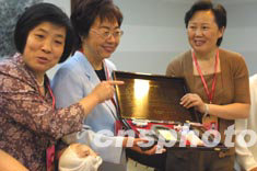 江西與澳門婦女代表成為聯(lián)誼“姊妹團”,澳門婦女聯(lián)合會副會長賀定一(左二)與江西婦聯(lián)主席李亞平(右一)互贈禮品。江西代表團贈送文房四寶祝愿澳門婦聯(lián)書寫濃墨重彩的新篇章。中新社記者:廖文靜