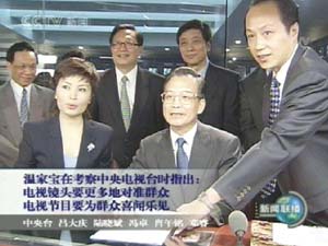 據(jù)央視國(guó)際報(bào)道,溫家寶今天下午考察了中央電視臺(tái),并與中央電視臺(tái)部分干部、記者、播音員、主持人進(jìn)行座談。溫家寶先后來(lái)到中央電視臺(tái)播控中心播控區(qū)、新聞中心演播區(qū),觀看了部分播控設(shè)施、演播室、演播廳等,還觀看了中央電視臺(tái)新臺(tái)址模型。會(huì)見(jiàn)了中央電視臺(tái)部分工作人員。隨后,溫家寶與中央電視臺(tái)一部分干部、記者、播音員、主持人座談。在座談會(huì)上,溫家寶要求每個(gè)發(fā)言人結(jié)合自己的具體工作,提出一個(gè)建議,或者反映一個(gè)問(wèn)題,或者談對(duì)一件事的體會(huì)。大家發(fā)言踴躍,氣氛十分熱烈。