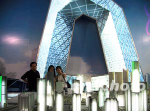 中央電視臺建臺四十五周年發(fā)展成就展八月二十九日在北京軍事博物館開幕,展出的中央電視臺新臺址模型吸引了眾人的目光。中新社記者:杜洋