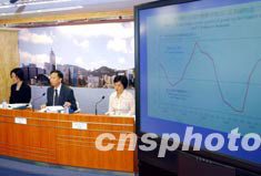 香港政府經(jīng)濟(jì)顧問鄧廣堯,8月29日就2003年第二季經(jīng)濟(jì)報(bào)告及2003年本地生產(chǎn)總值和物價預(yù)測舉行記者會,受SARS影響,今年第二季香港經(jīng)濟(jì)錄得負(fù)增長0.5%。不過,港府將全年經(jīng)濟(jì)增長預(yù)測,由1.5%調(diào)升至2%。中新社記者:洪少葵