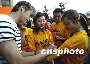 西門子移動(dòng)電話公司三十日為中國女子足球隊(duì)9月出征世界杯比賽舉行“萬人簽名為中國女足加油”活動(dòng)。中國男足隊(duì)員祁宏為“西門子小姐”邀簽名留念。中新社記者:趙振清