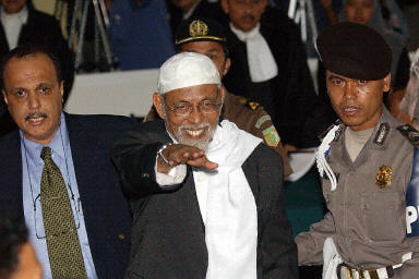 印尼一家法庭9月2日裁定被疑與“基地”組織有牽連的東南亞激進組織“伊斯蘭祈禱團”的精神領(lǐng)袖阿布·巴卡爾·巴希爾(中)參與了叛國行動,并判處他4年監(jiān)禁。巴希爾不服這個判決結(jié)果,表示將上訴。
