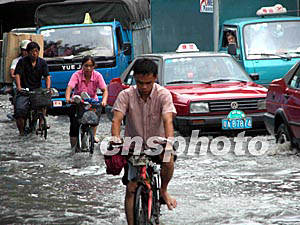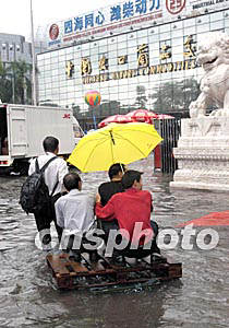 “杜鵑”臺風(fēng)給廣州帶來了狂風(fēng)暴雨,不少地方出現(xiàn)水淹現(xiàn)象,三日,廣州外貿(mào)中心正舉辦一個大型展覽,賓客們只好利用臨時拼造的“小舟”進(jìn)館。作者:梁永強(qiáng)