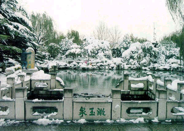 步出滄園,跨過(guò)楓溪島小橋,東北方向不遠(yuǎn)處一泓碧水,從地面涌出似一面明鏡,這便是七十二名泉中的漱玉泉,泉邊緣柳成蔭,泉水清澈見(jiàn)底,水石相激,淙淙有聲,猶如漱玉。由漱玉泉向西,柳絮泉、黃華泉、趴牛泉如一方碧玉,各展秀姿,并肩媲美。在柳絮泉邊和柳絮泉西北方,各有一石砌方池,這便是著名的金線泉和老金線泉。泉水中有兩道來(lái)自不同方向的泉水相撞,激起一道水紋,經(jīng)過(guò)陽(yáng)光一照,金光閃閃,故曰“金線”,因在一定氣候和條件下才能出現(xiàn)“金線”,故有誰(shuí)能看到金線,誰(shuí)交好運(yùn)的傳說(shuō)。
