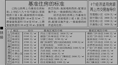 中新網(wǎng)9月5日電 北京市國土房管局昨天首次公布已購公房和經(jīng)濟(jì)適用房再上市的交易指導(dǎo)價(jià)格。