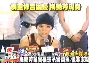 中新網(wǎng)9月5日電 藝人梅艷芳的健康狀況,最近成了香港熱門(mén)的八卦話題。有媒體言之鑿鑿說(shuō),這位香港歌壇的大姐大已身患重病。今天下午,梅艷芳在好友劉德華、張學(xué)友等圈中好友陪同下舉行記者會(huì),說(shuō)明自己的健康狀況,她坦承自己罹患了子宮頸癌。