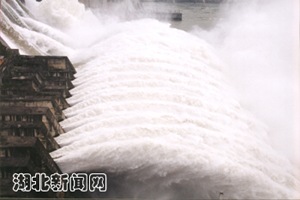 中新湖北網(wǎng)9月9日電 漢江第二次洪峰于八日凌晨一點(diǎn)到達(dá)丹江口水庫(kù),最大洪峰流量達(dá)二萬(wàn)八千五百立方米每秒,大約在今天下午五點(diǎn)丹江口水庫(kù)水位將達(dá)到一百五十六點(diǎn)七米,為一九八四年來(lái)最高水位。為緩解對(duì)水庫(kù)壓力,丹江口水庫(kù)開閘向下游泄洪。劉鐵軍 攝