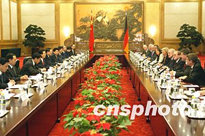 胡錦濤說,中德兩國人民有著長期友好交往的歷史,建交三十多年來,尤其是中國實行改革開放、德國重新實現(xiàn)統(tǒng)一后,兩國關(guān)系全面發(fā)展。兩國高層交往密切,雙方經(jīng)貿(mào)合作不斷擴大。我們贊賞德國歷屆政府堅持一個中國政策,保持對華政策的連續(xù)性,致力于中德友好。