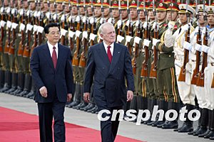 會談前,胡錦濤在人民大會堂東門外廣場為勞總統(tǒng)訪華舉行了歡迎儀式。