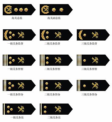 關(guān)務(wù)員關(guān)銜標(biāo)志為一道橫杠和一枚海關(guān)關(guān)徽,一級(jí)關(guān)務(wù)員關(guān)銜標(biāo)志為三枚星花;二級(jí)關(guān)務(wù)員關(guān)銜標(biāo)志為二枚星花。
