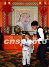 吉林省松原市郊的查干湖畔如今新建了許多觀光蒙古包,年幼的蒙古族男孩在中國元代英雄成吉思汗的肖像前持刀照相。成吉思汗的蒙古鐵騎大軍曾經(jīng)馳騁歐亞大陸而名垂青史。中新社記者:賈國榮