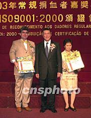 今日還同時舉行了澳門捐血中心獲得ISO九00一:二000質(zhì)量認(rèn)證頒證儀式,國家認(rèn)證認(rèn)可監(jiān)督管理委員會主任王鳳清專程前來頒發(fā)證書并致辭祝賀。