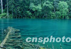 鈣華池山泉水里倒伏著松樹,此景距九寨溝口四十九公里,沿途是高山森林。