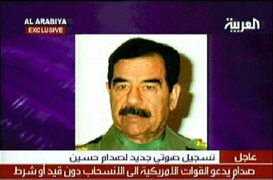 9月17日,設(shè)在阿聯(lián)酋首都迪拜的阿拉伯電視臺(tái)17日播放了一盤據(jù)稱是伊拉克前總統(tǒng)薩達(dá)姆錄制的最新錄音磁帶。薩達(dá)姆在錄音磁帶中要求說(shuō),美國(guó)必須無(wú)條件地將其駐伊美軍全部撤出伊拉克。