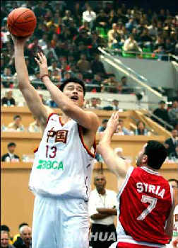 在全場觀眾的期待中,姚明首發(fā)出場,與張勁松、李可、朱芳雨、劉煒攜手上陣。緊逼防守和快速的反擊屢屢奏效,小巨人幾次漂亮的扣籃和蓋帽更是贏得滿場喝彩。相比之下,敘利亞隊顯得畏手畏腳,過于保守,完全沒有了上屆亞錦賽歷史性地打入四強的斗志。僅第一節(jié)比賽,中國隊就以三十二比九遙遙領(lǐng)先,姚明獨得十二分。