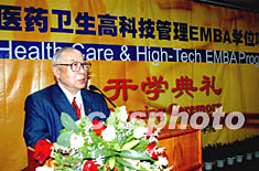 中山大學(xué)醫(yī)藥衛(wèi)生高科技管理EMBA學(xué)位項(xiàng)目的開學(xué)典禮二十六日在廣州中山大學(xué)嶺南學(xué)院舉行,這是中國第一個(gè)獲準(zhǔn)頒發(fā)醫(yī)療服務(wù)方向管理教育(EMBA)學(xué)位的項(xiàng)目。圖為嶺南(大學(xué))學(xué)院董事會名譽(yù)主席伍沾德先生在典禮上致詞。作者:羅仰明
