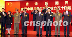 香港行政長(zhǎng)官董建華九月二十六日出席香港新聞界慶祝中華人民共和國(guó)成立五十四周年國(guó)慶酒會(huì)。圖為董建華(右四)等向嘉賓祝酒。中新社圖