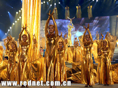 踩著歡快激昂的節(jié)奏,在數(shù)百名身著金色華服演員的簇?fù)碇,美麗的“金鷹女神”張開了巨大的金色羽翼,象征著中國電視正展翅飛向世界……以大型群舞《金色狂想》開場的本屆金鷹節(jié),金碧輝煌和大氣磅礴的場景將“中國電視年度盛典”的非凡氣勢表現(xiàn)得淋漓盡致。