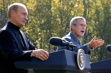 普京和布什兩人在華盛頓附近的戴維營(yíng)舉行了一次兩天的會(huì)談。他們也談到了有關(guān)車(chē)臣地區(qū)的持續(xù)不斷的沖突。兩人形容自己為“對(duì)抗恐怖活動(dòng)戰(zhàn)爭(zhēng)中的盟友”。