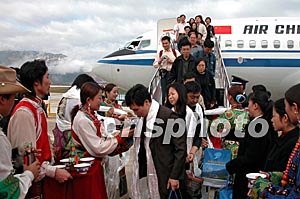 28日上午8點(diǎn)40分,104名來自全國各地的游客搭乘國航西南公司5027號波音737—600客機(jī)經(jīng)過45分鐘的飛行順利抵達(dá)九寨黃龍機(jī)場,宣告九寨航線正式通航。圖為當(dāng)?shù)夭刈迕癖姭I(xiàn)上青稞酒和哈達(dá),迎接來自各地的首航游客。作者:易世忠