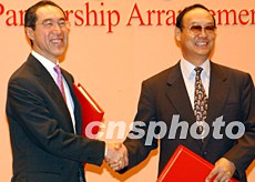 “內(nèi)地與香港關(guān)于建立更緊密經(jīng)貿(mào)關(guān)系的安排”附件簽署儀式,九月二十九日在香港舉行,商務(wù)部副部長(zhǎng)安民和香港財(cái)政司司長(zhǎng)唐英年,分別代表中央人民政府和香港特別行政區(qū)政府,簽署“內(nèi)地與香港關(guān)于建立更緊密經(jīng)貿(mào)關(guān)系的安排”附件。中新社記者:錢(qián)興強(qiáng)