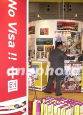 日本人赴中國(guó)短期旅行免簽證,成為招徠日本游客的新手段,十月三日在日本橫濱開(kāi)幕的世界旅行博覽會(huì)上,中國(guó)展臺(tái)豎起了免簽證的宣傳牌。作者:王健