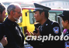 參加國慶值勤的北京警察學(xué)院學(xué)員,四日在天安門廣場為外國游人解答問題!笆弧逼陂g首都警方加大了旅游景區(qū)的值勤力量,以確保游客安全。中新社記者:宋吉河