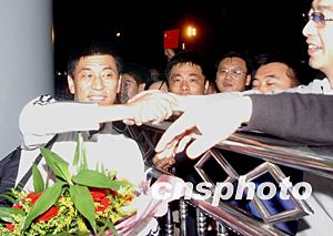 十月四日晚,剛剛抵達(dá)北京的中國女子足球隊(duì)主教練馬良行在首都國際機(jī)場受到球迷們的熱烈歡迎,中國女足雖然沒有完成進(jìn)軍前四的預(yù)定任務(wù),但她們?cè)趫錾系钠床褚廊坏玫角蛎缘恼J(rèn)可。中新社記者:武仲林